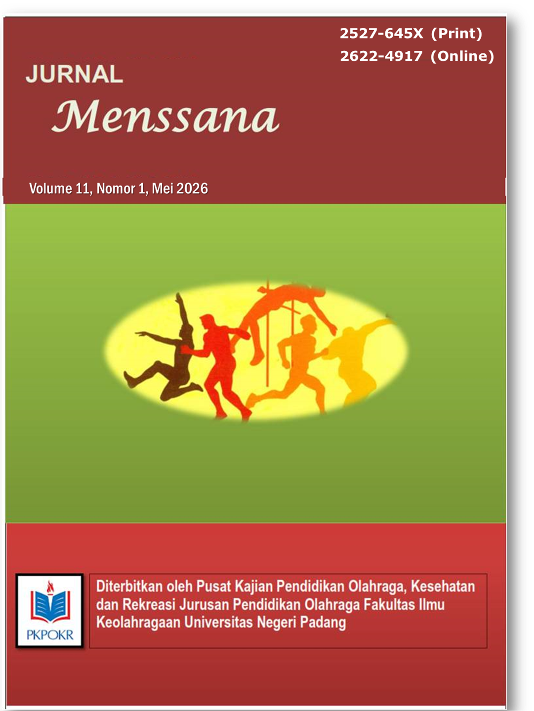 Vol 11 No 1 (2026)Jurnal MensSana merupakan jurnal ilmiah hasil penelitian, berisikan Naskah tentang pendidikan olahraga untuk khalayak internasional peneliti pendidikan olahraga dan ilmu keolahragaan. Jurnal ini bertujuan untuk menyediakan forum pemahaman ilmiah tentang bidang pendidikan olahraga dan memainkan peran penting dalam mempromosikan proses akumulasi pengetahuan, nilai, dan keterampilan yang ditransmisikan dari satu generasi ke generasi lainnya; dan untuk membuat metode dan isi evaluasi penelitian dalam pendidikan olahraga.
